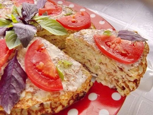 Собираем тортик: положив на блюдо первый блинчик, смазываем его соусом, посыпаем тёртым сыром. Сверху кладём второй блинчик, также промазываем заправкой и посыпаем сыром. Дополнительно можно прослоить тортик помидорными кружочками – или оставить их для украшения.