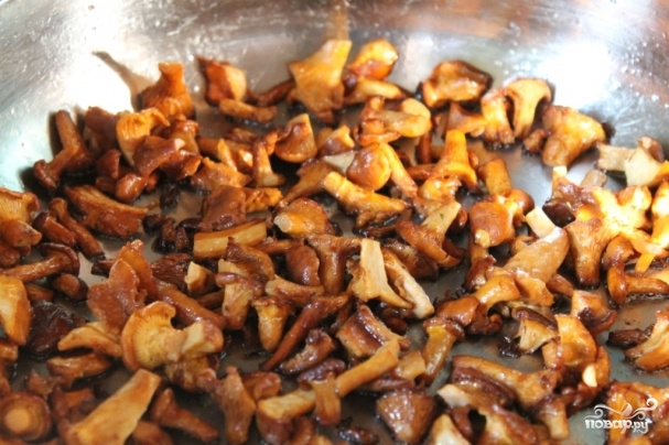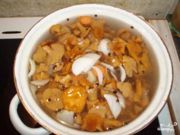 Лисички тщательно промойте под холодной водой, очистите их от лесного мусора и пленок. Затем отварите в подсоленной воде 15 минут, в воду можно кинуть половинку репчатого лука и несколько горошин перца.